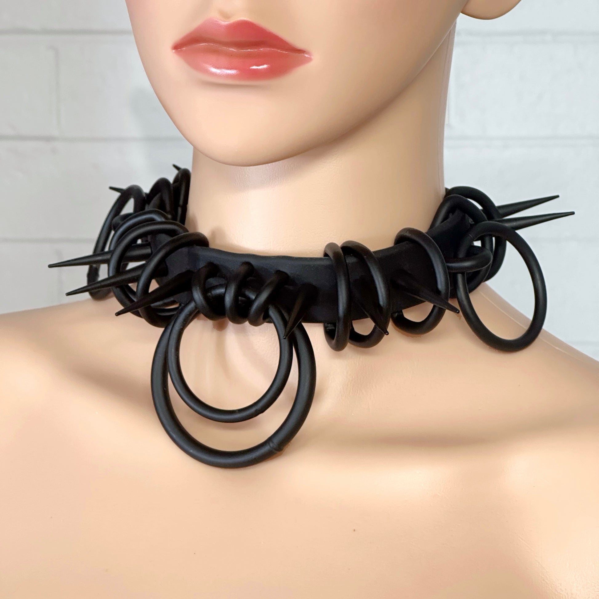 These have a solid Black Biothane strap. This design has powder coated black solid steel alloy spikes, and o rings.