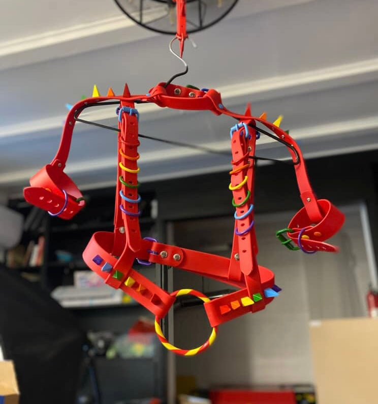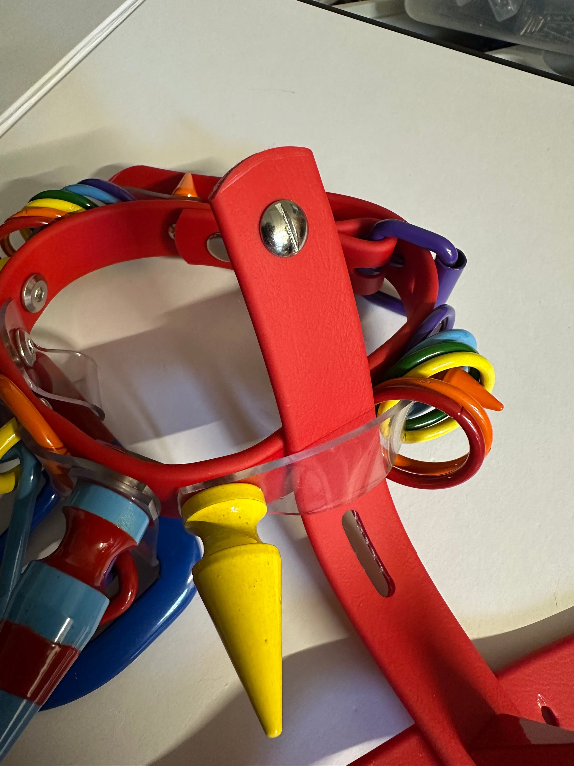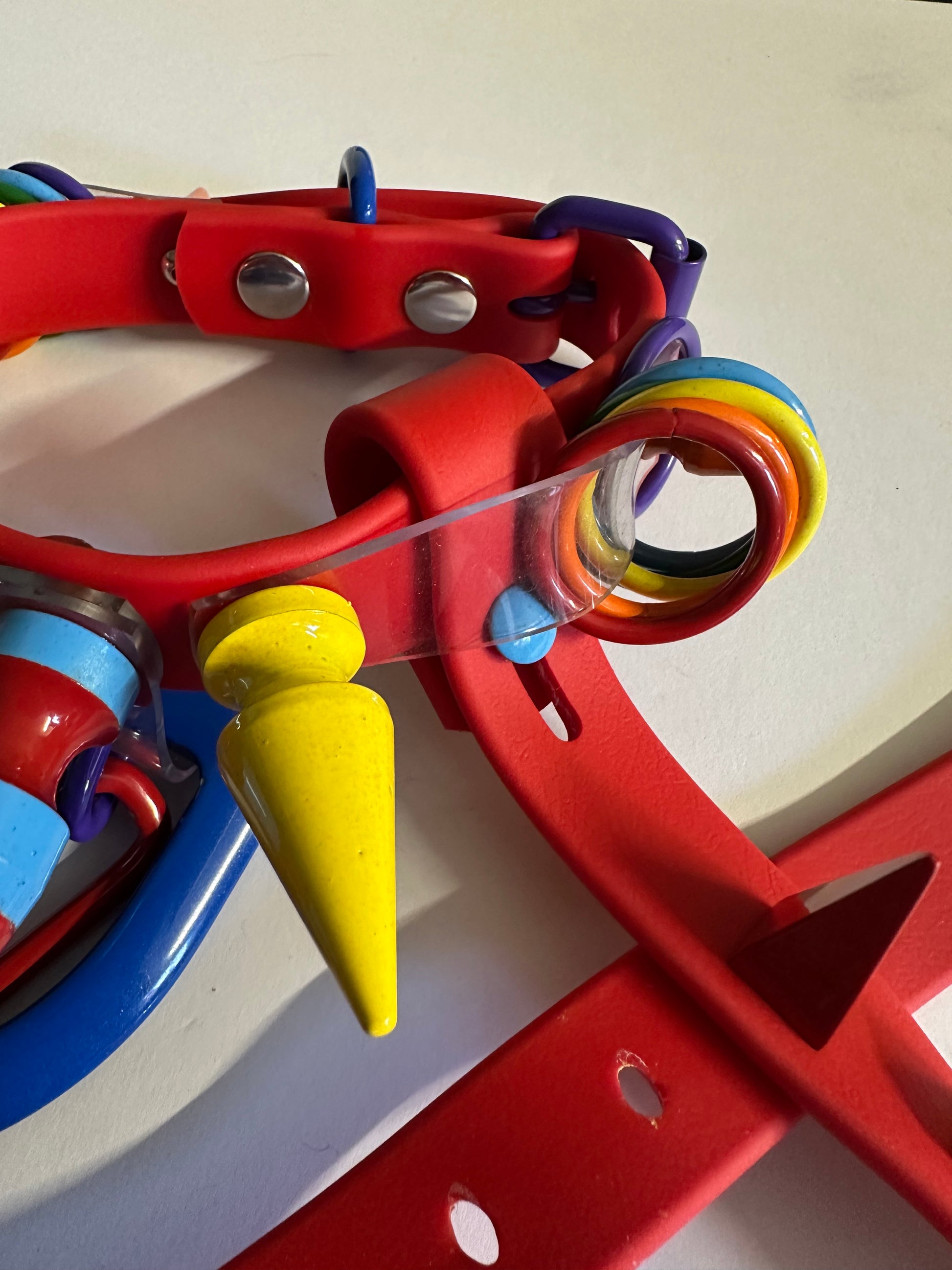 These have a vivid red Biothane strap. This design has powder coated rainbow solid steel alloy spikes, and o rings/d rings. There is no plastic hardware on this piece!