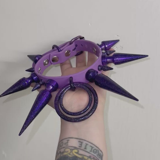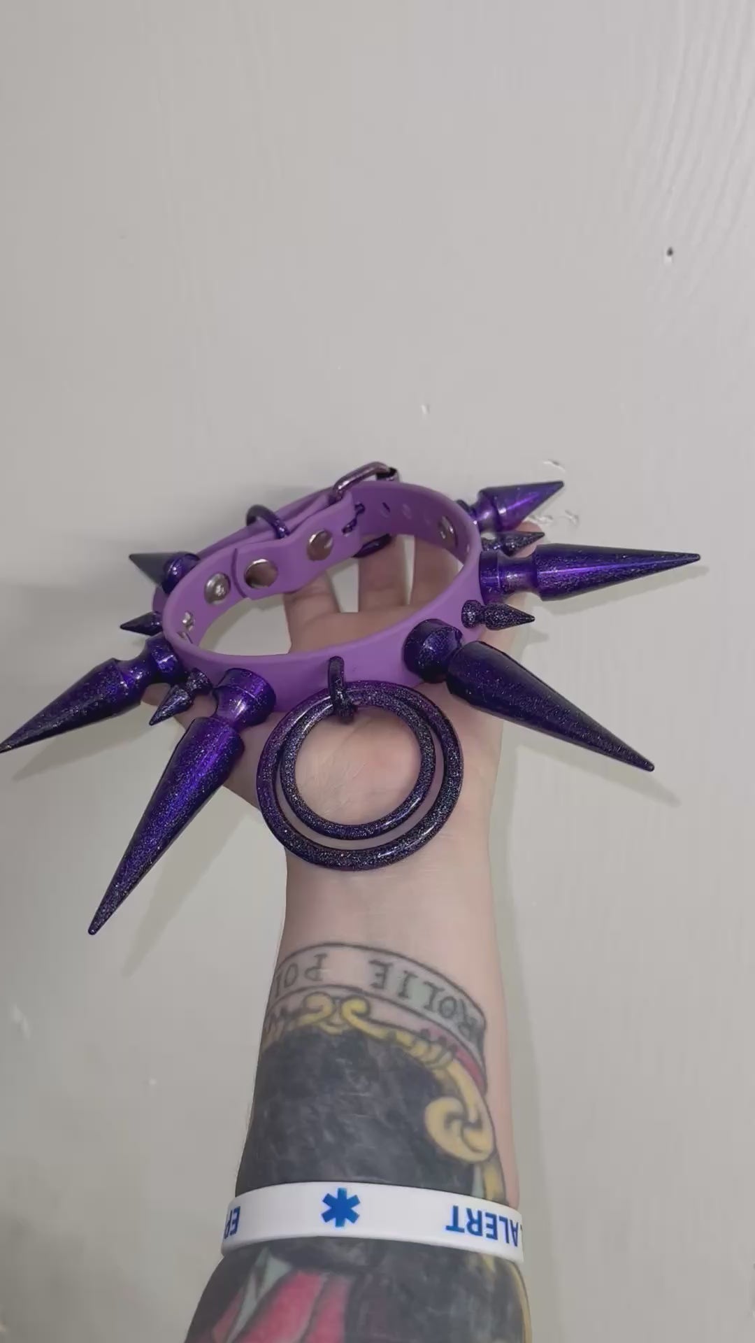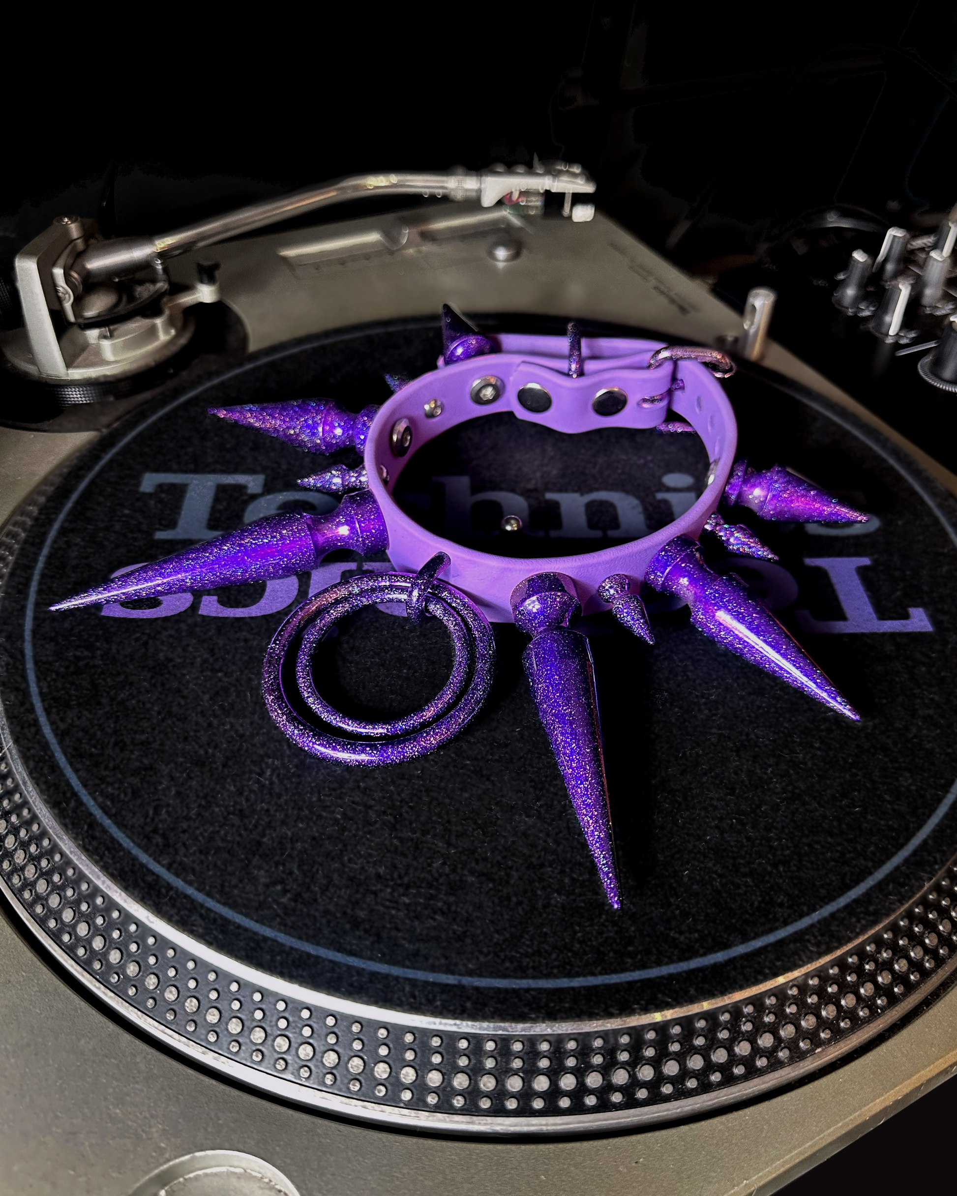 These have a vivid lilac Biothane strap. This design has powder coated holographic glitter purple solid steel alloy spikes, and o rings. It's hard to capture how intense these are in camera!