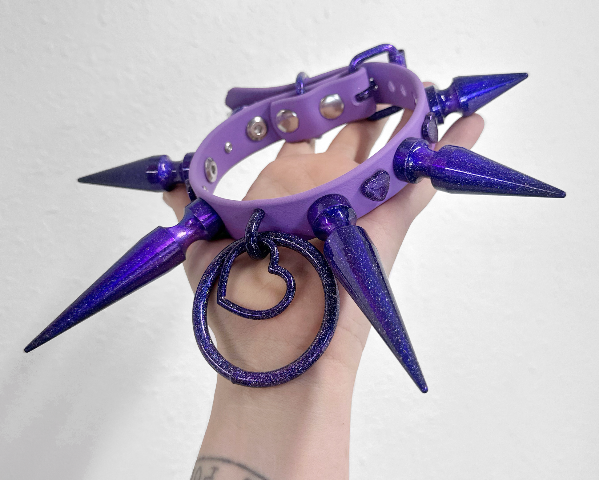 These have a vivid lilac Biothane strap. This design has powder coated holographic glitter purple solid steel alloy spikes, Hearts, and o rings. It's hard to capture how intense these are in camera!