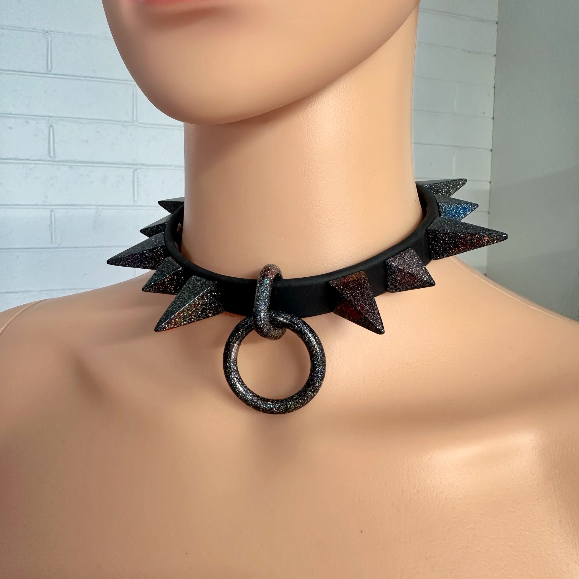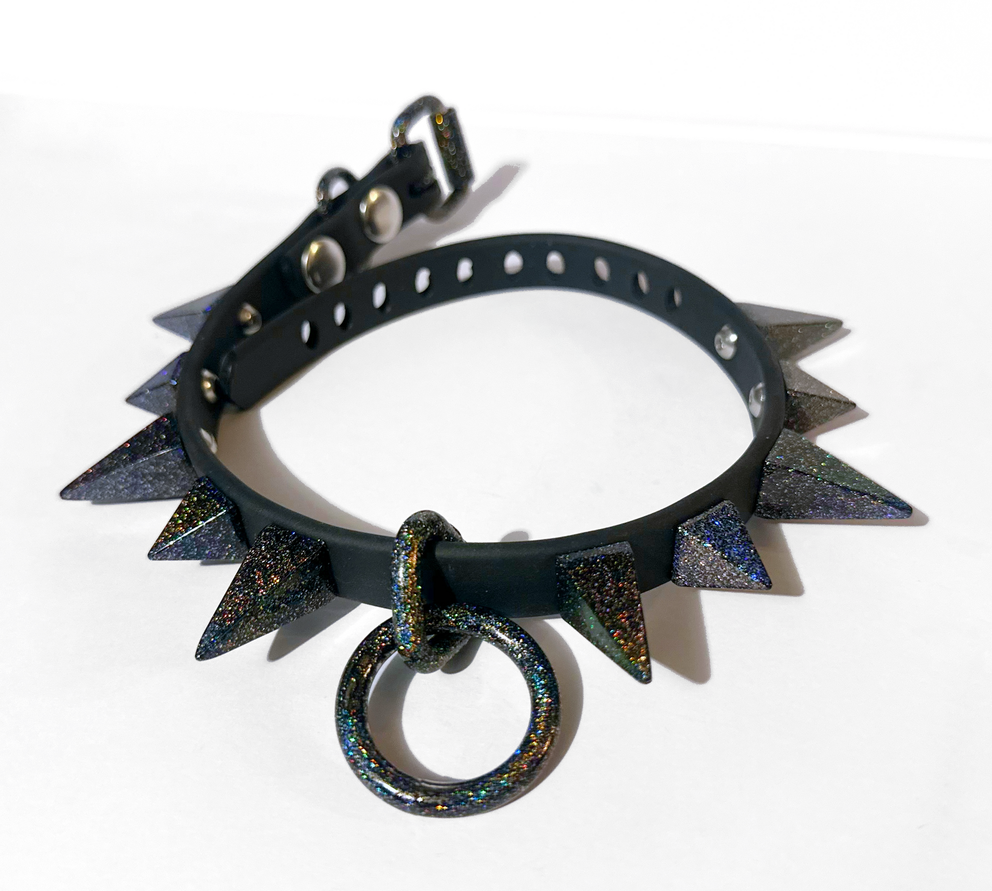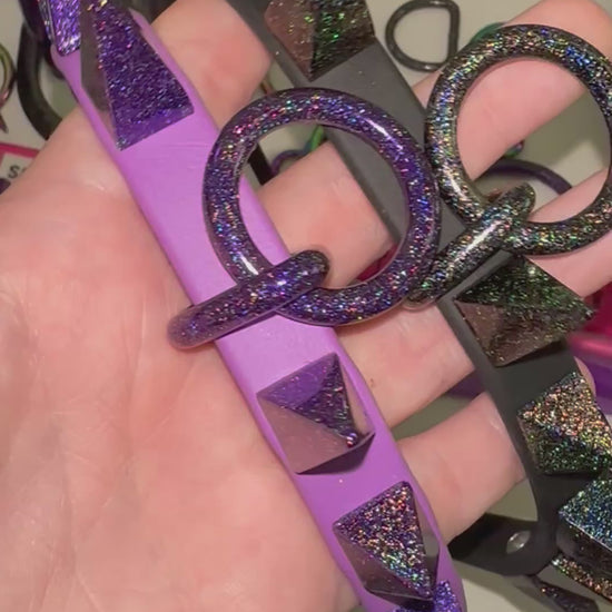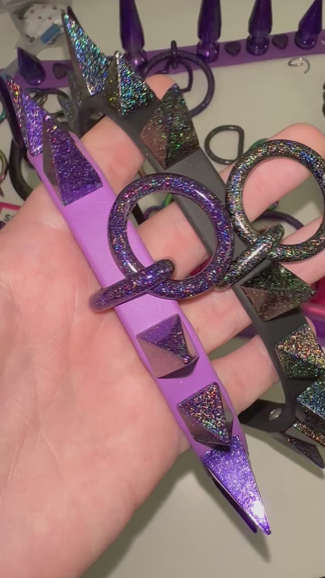 These have a vivid lilac Biothane strap. This design has powder coated holographic glitter Black solid steel alloy spikes, and o rings. It's hard to capture how intense these are in camera!