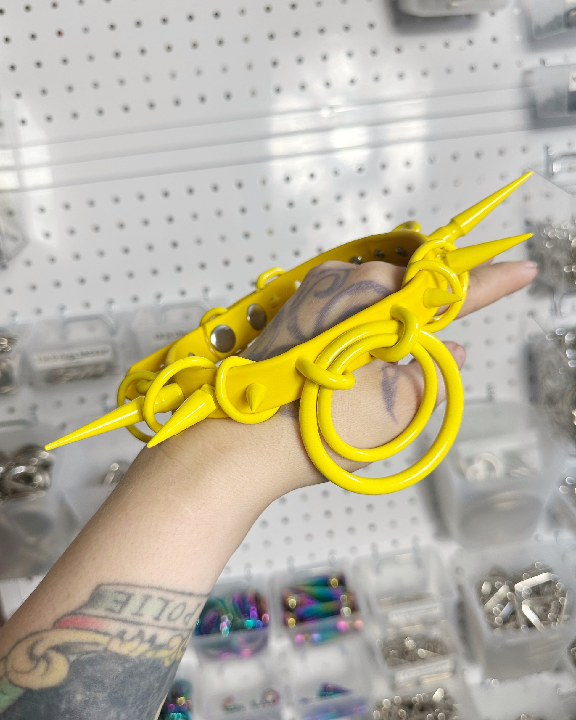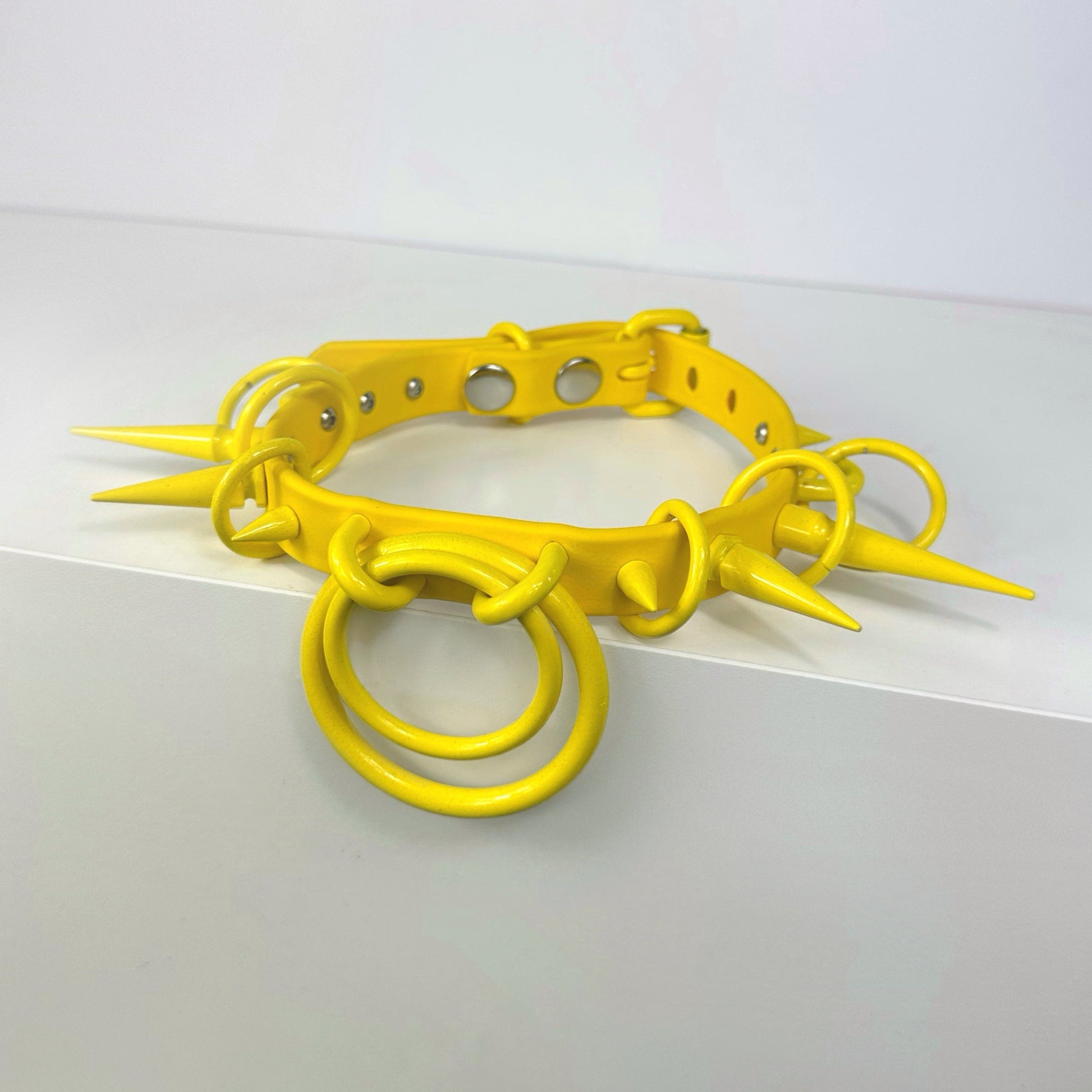 These have a vivid solid sunny yellow Biothane strap. This design has powder coated yellow solid steel alloy spikes, and o rings.