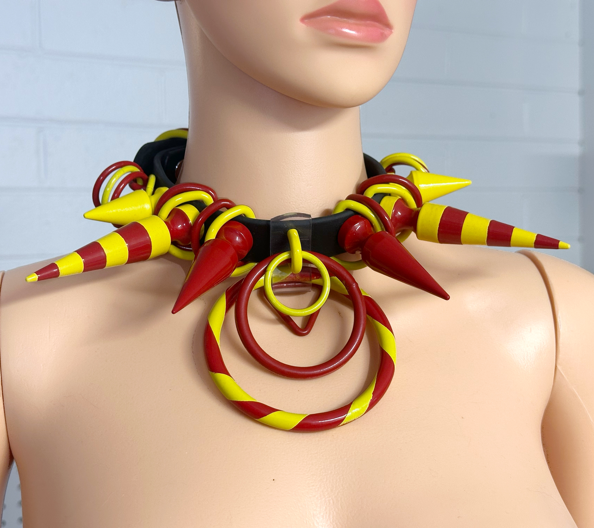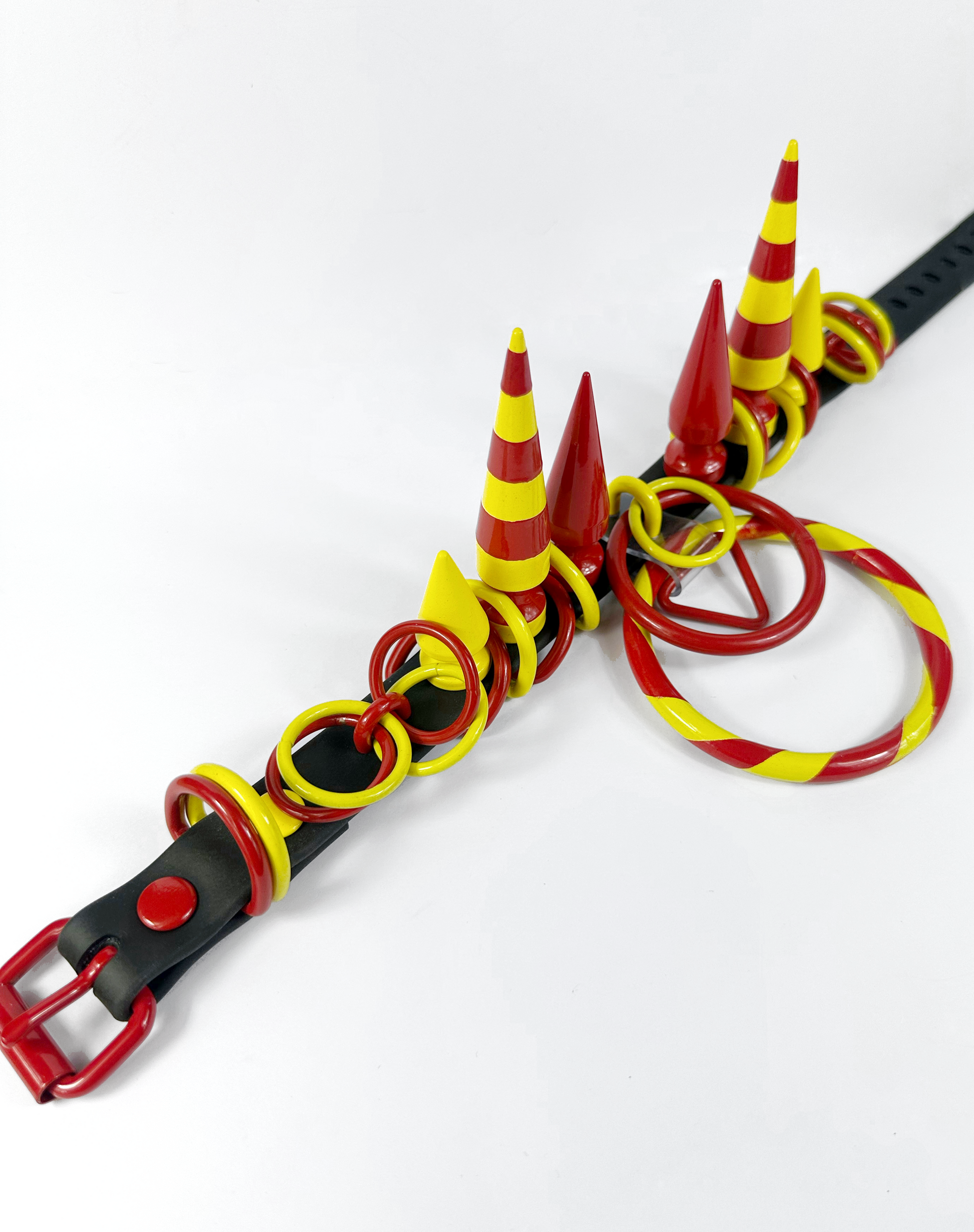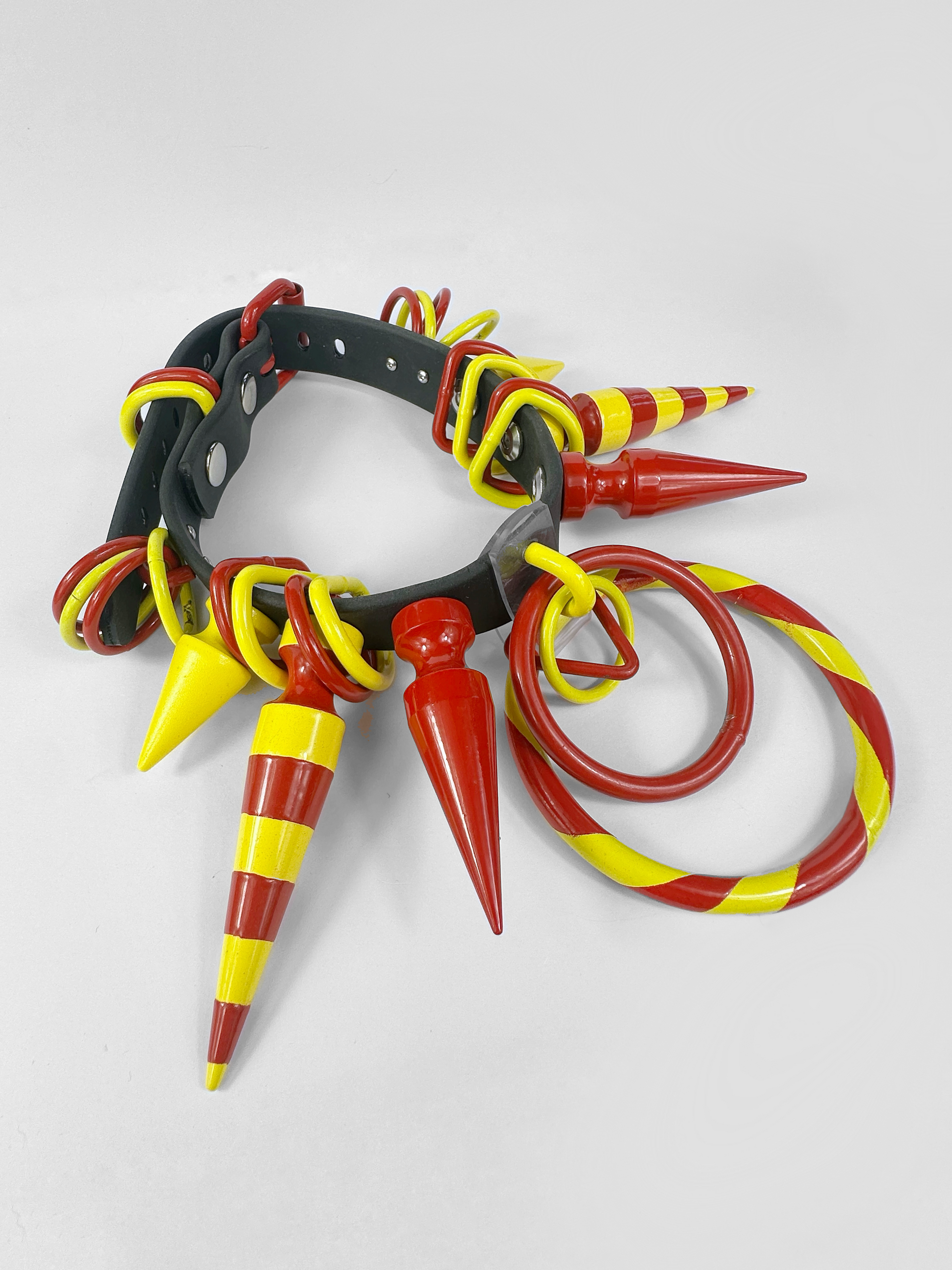 These have a black Biothane strap. This design has powder coated red and yellow solid steel alloy spikes, and o rings.